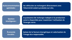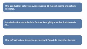 En effet, Les solutions que nous proposons associent bornes de recharge (IRVE) intelligentes et production photovoltaïque locale afin de réduire les coûts d’énergie et les émissions de CO₂ :
